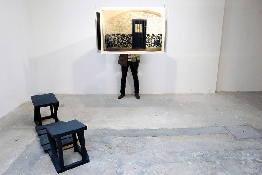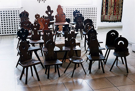 Le Musée antidote, 2012-2014. Détail: au musée du Paysan roumain, « Petites chaises en bois réunies sur un carré peint sur le carrelage ».